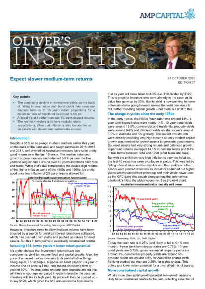 Despite a 35% or so plunge in share markets earlier this year; on the back of the pandemic and rough patches in 2018, 2015 and 2011, well diversified Australian investors have seen pretty good returns over the last 10 years. The median balanced growth superannuation fund returned 5.8% pa over the five years to August and 7.3% pa over 10 years and that’s after fees and taxes. While that’s dull compared to the double digit returns of the higher inflation world of the 1980s and 1990s, it’s pretty good once low inflation of 2% pa or less is allowed for.